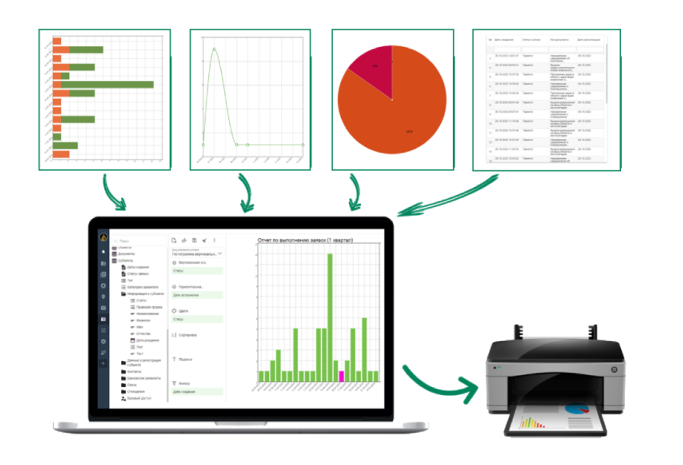 Формируйте аналитическую и статистическую отчётность в виде таблиц, графиков, схем, диаграмм, настраивайте шаблоны для формирования основных документов.